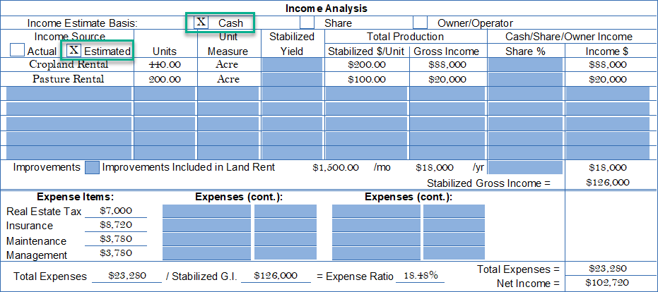 The Income Analysis has not changed. Note, “Estimated Cash” bases were checked (green boxes). If “share” or “owner/operator” are used, the remaining blank fields in the example will have to be filled accordingly. All sales and subject should be analyzed on the same income basis. There are four fixed expense categories with eight (8) more variable fields in two columns.