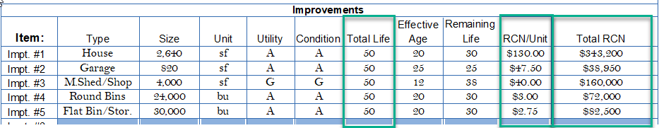 Once the total life and effective age are entered, the remaining life is computed. The RCN/Unit is entered building-by-building, the total RCN is computed and transferred into the cost approach.
