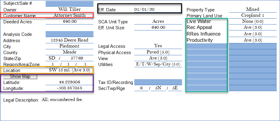 There is are several new fields (red and purple boxes); and one important cell moved (Eff. Date (black box)). The “Customer Name” which could be lender, client, or something else. The purple box is for the subject’s latitude and longitude for geo-referencing (distance in some of AgWare’s programs). The "Location" entry many seem slightly more compliciated, but the mere statement of SW 15 mi. means something to the valuer but many not assist the reader or reviewer --- depending on their knowledge of the area. The rating (Ave 3.0 (on a scale of 5)) may help the presentation and visual differences between the sales and subject.