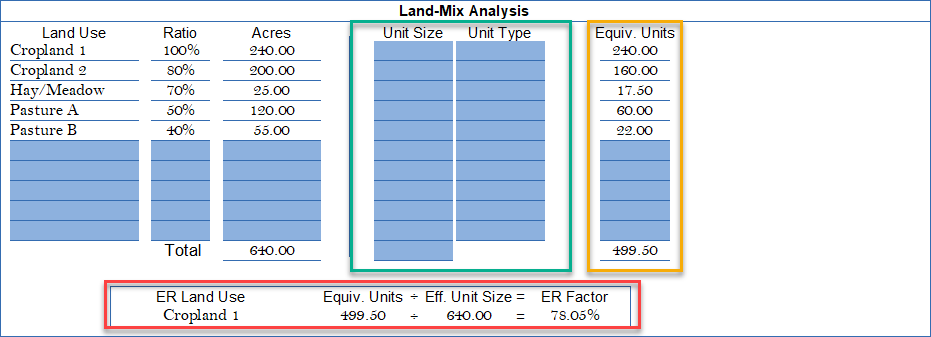The subject equivalent units (yellow box) can ONLY be derived from ratios and are part of the final ER Factor calculation (red box). In this example, the Subject’s ER Factor of 78.05% means its composition is something less than 100% because there are inferior land types that contribute less ($/Acre) than Cropland 1 (the data standard for the market area). ASFMRA textbooks and courses are source and provided the basis for this procedure. Additional “Help” sections are available on the Website.