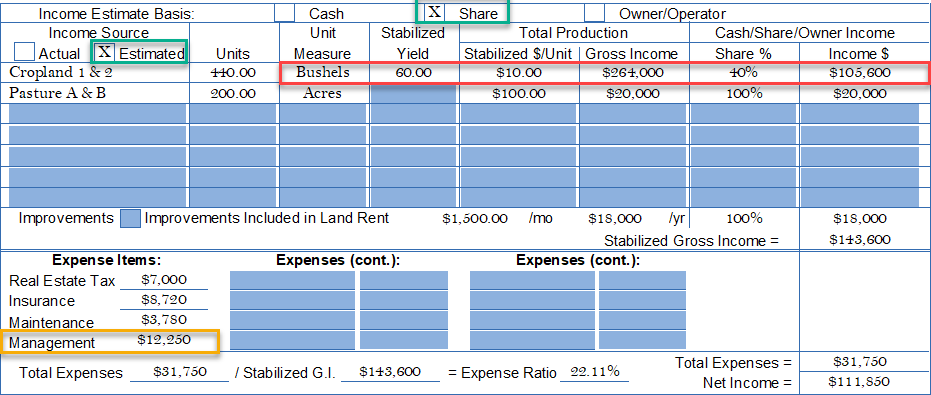 When using Share or Owner/Operator, the income involves the "business of agriculture" or includes and management decisions beyond that experienced by just "cash" rental. Hence, "Yield and Share %" become part of the calculation will accelerated Management Expenses (yellow box) due to active involvement by the owner with the tenant in production decisions. The user should used the same income basis for the sales and subject.