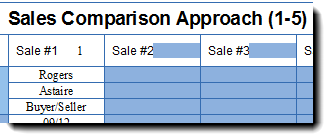 Now it will be easy to transfer the sales’ data into the approach pages by their number. Enter the desired sale’s number directly on the approach page itself. For example, to transfer Sale #1 into the first column on the Sales Comparison Approach page, enter the number 1 in the Sale # cell as shown below. In other words, you are telling the software that the sale you identified as sale #1 is to be identified on the approach pages as sale #1 in the first column. The assumption is that if you labeled a sale as sale #1, you want its data placed in the first column.