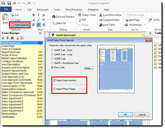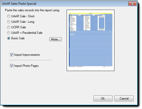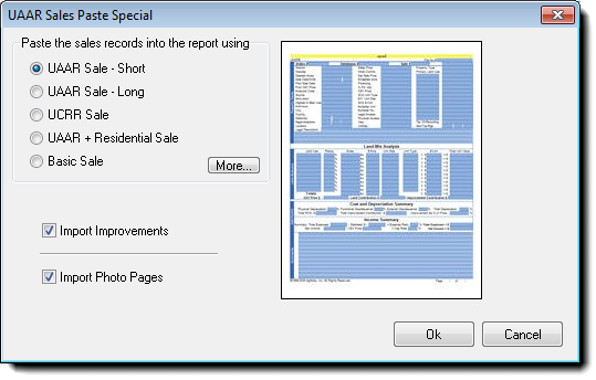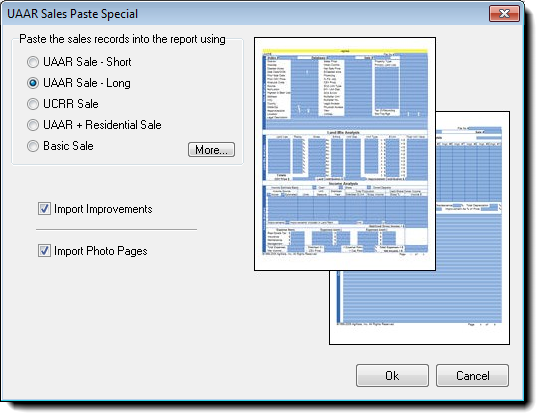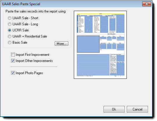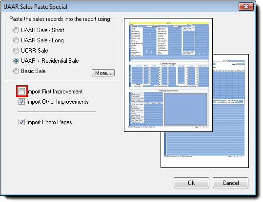 The sale will come into the report using the format set in File→Preferences→UAAR Sale Form (importing Improvements and Photo Pages if they are checked).