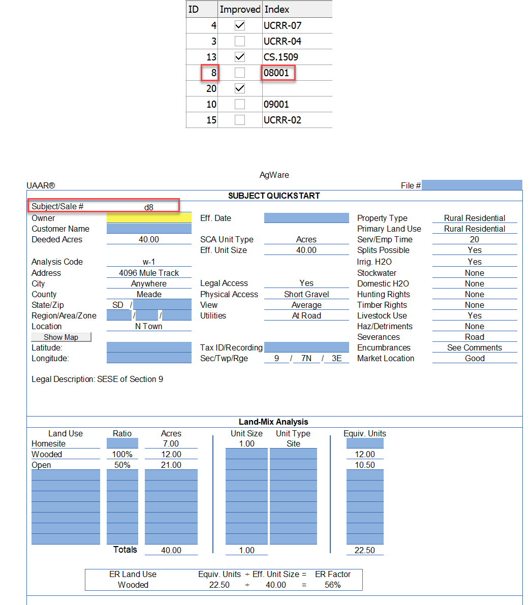 In ClickForms on the Subject Quickstart page, type the 'd' or 'i' number. In the example below, the ID number was used (d8). Alternatively, it could have been brought in using the Index Number (i08001).